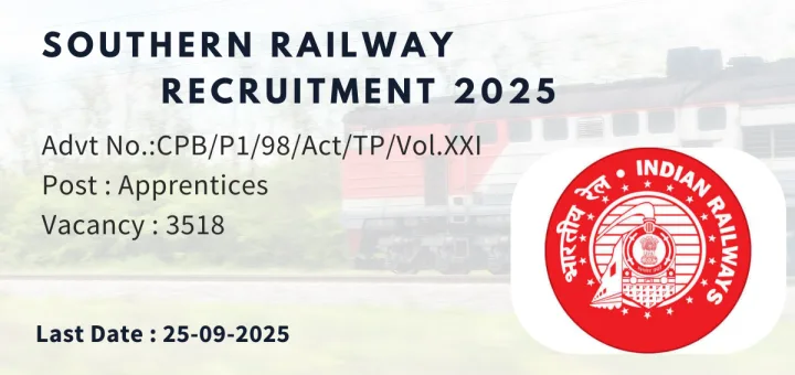 Recruitment Body: Southern RailwayAdvt No.: CPB/P1/98/Act/TP/Vol.XXIPost Date: 26-08-2025Job Type: Apprenticeship Training 🔑 Key Highlights 📅 Important Dates 📝 Vacancy Details 🎓 Eligibility Criteria Educational Qualification: Age Limit (as on closing date): 💰 Application Fee...