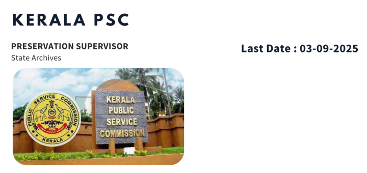 Kerala Public Service Commission – Recruitment Notification Post: Preservation SupervisorDepartment: State ArchivesScale of Pay: ₹39,300 – ₹83,000/-Vacancies: 03 (Three) – currently existing 1. Eligibility Criteria Age Limit Educational & Technical Qualifications Additional Notes: 2....