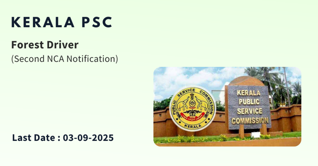 ✅ Summary: Kerala PSC invites online applications from male candidates belonging to SC (Kollam) and LC/AI (Kollam & Thrissur) communities for Forest Driver posts in the Kerala Forest & Wildlife Department. Candidates must have SSLC, valid heavy vehicle driving license, 3 years’ driving experience, prescribed physical standards, PET qualification, and medical fitness. Applications should be submitted online through Kerala PSC OTR by 03 September 2025.