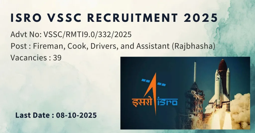 The Vikram Sarabhai Space Centre (ISRO VSSC) has released an official recruitment notification (Advt No: VSSC/RMTI9.0/332/2025) for 39 vacancies across multiple posts including Fireman, Cook, Drivers, and Assistant (Rajbhasha).
