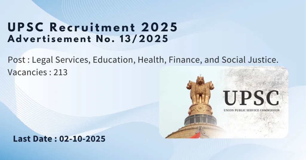 The Union Public Service Commission (UPSC) invites online applications for 213 vacancies across multiple posts in Legal Services, Education, Health, Finance, and Social Justice.